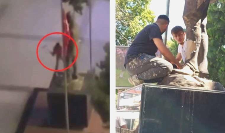 Çevredeki bir binadan cep telefonu kamerasıyla kayda alınan manzarada; şüphelinin elindeki balyozla anıtın bacaklarının ön ve art kısmına tekraren vurduğu, akabinde bir mühlet de heykel önünde oturduğu yer aldı.