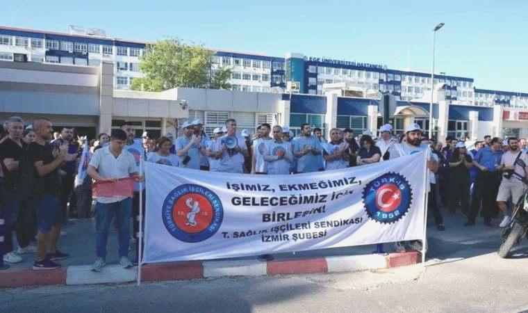 Ege Üniversitesi Hastanesi çalışanları toplu iş kontratından (TİS) doğan alacakları için bir günlük iş bıraktı. Türkiye Sıhhat Emekçileri Sendikası (Sağlık-İş) İzmir Şube üyesi personeller, poliklinikler önünde bir ortaya gelerek alacaklarının bir an evvel ödenmesini istedi.