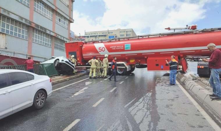 Park halindeki bir arabaya çarpan tanker yan durarak yolu kapattı. Tankerin çarptığı araba bir işyerinin bahçesinde park halindeki kamyonetin üzerine düştü.